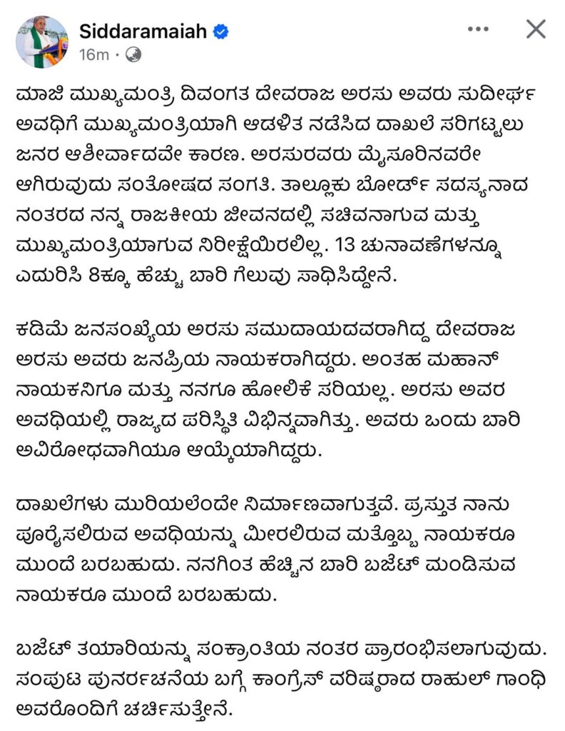 ದೇವರಾಜ್ ಅರಸ್ ಸುದೀರ್ಘ ಅವಧಿಯ ಮುಖ್ಯಮಂತ್ರಿ ದಾಖಲೆಯನ್ನು ತಮ್ಮ ಆಡಳಿತ ಮುರಿಯಲಿದ್ದು, ಅರಸು ಮೈಸೂರಿನವರೇ ಆಗಿರುವುದು ಸಂತೋಷದ ಸಂಗತಿಯಾಗಿದೆ.